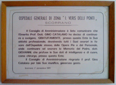 Aspettando il turno per una radiografia all’ospedale di Scorrano, in fondo ai vecchi padiglioni in pietra leccese, mi cade l’occhio su questa targa ricordo. E’ del 1 novembre 1971. Il Dottor Gino Catalano, notissimo a Castro, rinuncia al proprio stipendio destinandolo in beneficenza all’ospedale stesso. L’Amministrazione ringrazia.