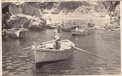 Luigi lavorerà quasi sempre al porto a servizio di turisti e villeggianti. Le foto lo riprengono alla Grotta del Conte intorno al 1957. C’è ancora la vecchia scaletta diritta tagliata nel carparo. Nella prima foto del post si nota meglio la sistemazione della Grotta del Conte in quel periodo. La scaletta nel tufo, la grotticella sulla sinistra, una cabina spogliatoia murata nella roccia, le prime gettate di calcestruzzo sulla destra.