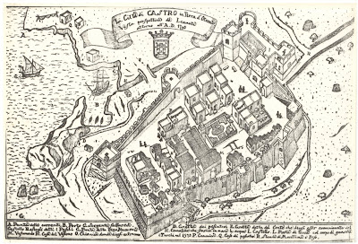 Salta fuori questa vecchia stampa che rappresenta una veduta di Castro del 1790. E’ la vista da Levante della più nota vista da Scirocco (1795) che si vede appesa in molte case di Castro. Stupisce la padronanza della rappresentazione a volo d’uccello e di molti particolari delle architetture presenti. Per molti versi è un mistero, in quanto troppi elementi la fanno sembrare apocrifa. Giocate un po a cercarli.